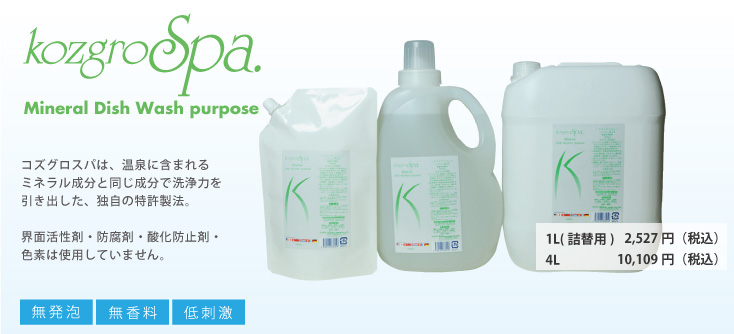 コズグロスパ 食器洗い機用洗剤は界面活性剤0%無発泡洗浄剤です。清浄作用のあるミネラルの力で、しつこい油汚れを強力に落とす環境にもやさしい無機質 食器洗浄機用洗浄剤です。